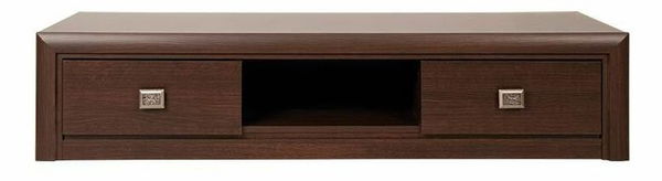 Široký TV stolík, ktorý sa vyznačuje modernými a elegantnými prvkami - lišty sú zaoblené, má jemné vyrezané línie okolo zásuviek a výrazné zdobené kovové úchyty. V ľavej a pravej časti stolíka sa nachádza zásuvka. Uprostred stolíka je voľná polička pre vaše AV zariadenia.