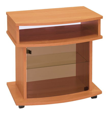 Menší TV stolík na kolieskach má priestor na audio/video, pod ktorým sa nachádza presklenná vitrína s jednou poličkou. Možnosť vybrať si z viacerých farebných prevedení.