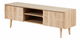Dodajte svojmu interiéru retro atmosféru vďaka tomuto nadčasovému stolíku pod televízor. Kúsok je vyrobený z pevných a odolných materiálov s povrchovou úpravou v prírodnom odtieni svetlého dreva. Dvere skriniek sú zdobené geometrickými bielymi líniami, ktoré zdôrazňujú jeho minimalistický dizajn. Usporiadajte svoju obývačku pomocou tohto priestranného stolíka, vďaka ktorému bude stále pôsobiť úhľadne a čisto.