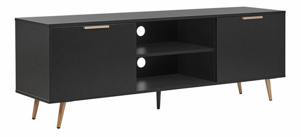 Jednoduchý, no elegantný, tento TV stolík je z hľadiska dizajnu rozhodne jedným z najuniverzálnejších kúskov. Jeho klasická čierna povrchová úprava, zlaté akcenty a jednoduchý tvar z neho robia ideálny doplnok do tradičných i moderných priestorov. Je vyrobený z umelého dreva, takže je odolný a má dlhú životnosť. Jeho kovové nohy sú vybavené gumovými krytmi, ktoré dodatočne chránia podlahu pred poškodením. Priestranné skrinky a police sú ideálne na uloženie všetkých druhov príslušenstva, kníh alebo časopisov. Stolík má taktiež praktické otvory v zadnej časti, ktoré vám umožňujú jednoducho pripojiť všetky elektronické zariadenia.