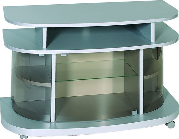 Zaujímavý TV stolík oválneho tvaru s presklenými tromi skrinkami v strede a po stranách. V strede je skrinka vybavená jednou sklenou poličkou a po stranách sa nachádzajú plne drevené poličky. Nad skrinkami je umiestnená vyvýšená polica na TV. Prevedenie strieborná farba.