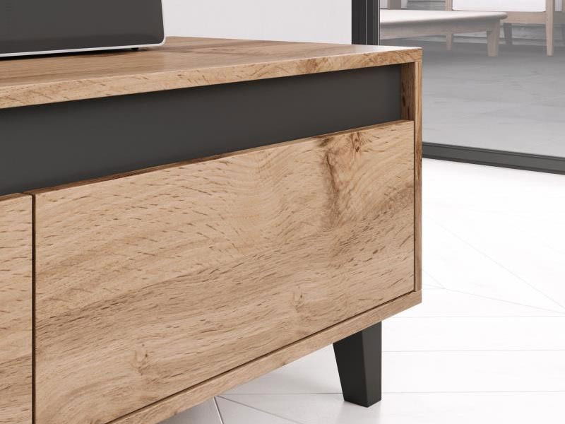ZobraziťTV stolík Nell (drevo + čierna) je praktický nábytok pre modernú obývaciu izbu. Jeho elegantný dizajn v čiernej farbe spolu s drevenými detailami dodáva vašej miestnosti štýlový vzhľad. Stolík má výšku aj hĺbku 0 cm, takže sa ľahko prispôsobí ktorékoľvek veľkosti televízora. Rukoväť na dvierkach umožňuje pohodlné otváranie a zatváranie úložného priestoru. Osvetlenie nie je zahrnuté v balení, ale môže byť objednané samostatne v nášho e-shope. S TV stolíkom Nell (drevo + čierna) budete mať nielen praktický miesto pre váš televízor, ale aj štýlový doplnok do vašej obývacej izby.