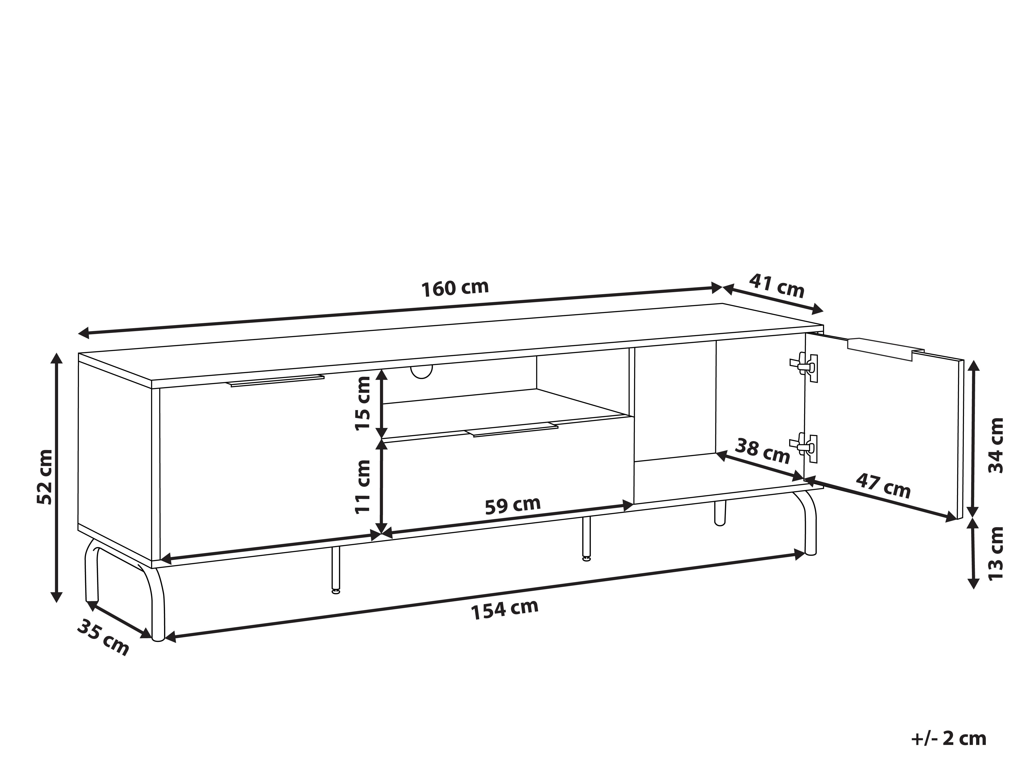 Skrášlite svoju obývačku s touto televíznou skrinkou, ktorá nielenže ponúka dostatok úložného priestoru, ale aj priťahuje pozornosť a rýchlo sa stane ústredným bodom v miestnosti. Komoda má priestrannú zásuvku, ktorú možno použiť na uloženie diaľkových ovládačov, káblov či iných potrebných predmetov. Okrem toho má dve praktické skrinky, ktoré sú ideálne na uloženie kníh či iných dokumentov. V zadnej časti nábytku sa nachádza otvor, ktorý umožňuje priechod káblov. Skrinka je vyrobená z drevotrieskovej dosky nenáročnej na údržbu, pričom stabilitu výrobku zaisťujú kovové nohy v ladiacej čiernej farbe.