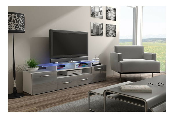 TV stolík + skrinka Blaise (biela + sivý lesk) (osvetlenie LED biele)