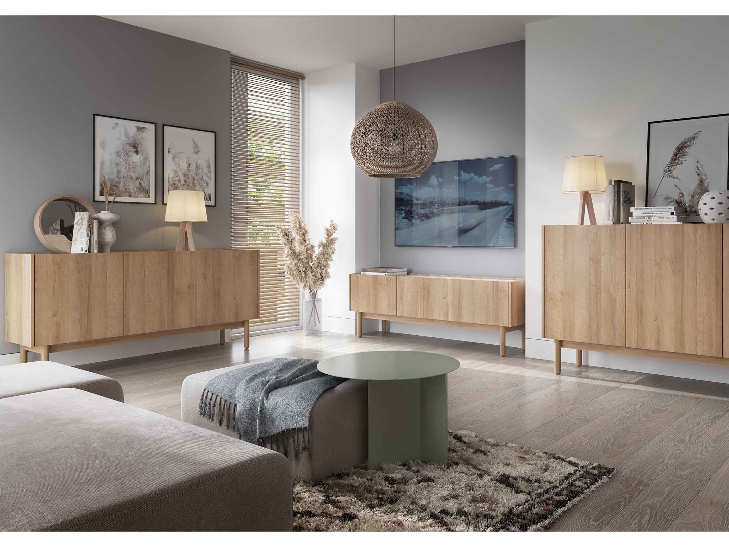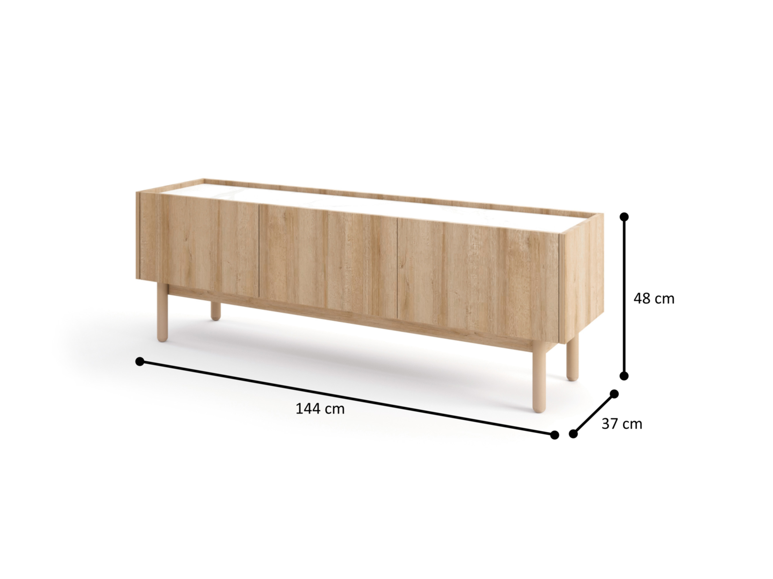 TV stolík/skrinka Bohemia je kvalitný a praktický nábytok pre obývačku s výškou 48 cm a hĺbkou 37 cm. Tento nerohový stolík je vyrobený z dreva s laminovanou doskou hrúbky 16 mm, ktorá mu dodáva pevnosť a odolnosť. Stolík má dostatok miesta pre audio/video zariadenia, ktoré môžete usporiadať podľa svojich potrieb. Drevené nožičky dodávajú stolíku štýlový vzhľad a zároveň zvyšujú jeho stabilitu. TV stolík/skrinka Bohemia je široký a preto sa hodí aj pre väčšie televízory. Stolík nemá sklo, čo ho robí bezpečným pre deti a zvieratá. Má laminovanú dosku hrúbky 16 mm a ABS hrany 0,5 mm. Nožičky sú drevené a majú výšku 19,5 cm. Dvierka sa otvárajú pomocou prečnievajúcich dosiek.