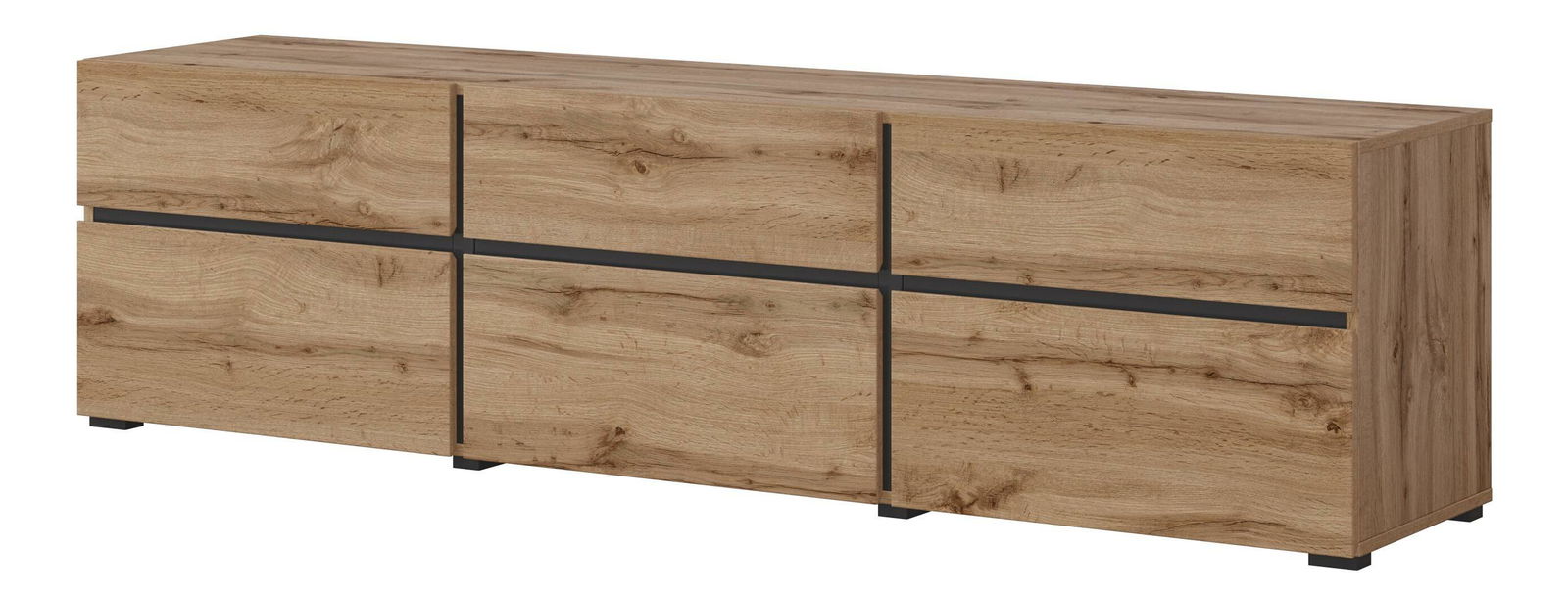 Táto moderná TV skrinka je ideálna pre tých, ktorí hľadajú funkčný a elegantný doplnok do obývacieho priestoru. Vyrobená z kvalitnej laminovanej drevotriesky s ABS hranami, je odolná a ľahko sa udržiava. Má nízke čierne nožičky, ktoré dodávajú stabilitu a sofistikovaný vzhľad. Skrinka je vybavená bezúchytkovým systémom, ktorý zaisťuje hladké a jednoduché otváranie bez rušivých prvkov. Ponúka tri zásuvky a tri dvierka s výklopným otváraním smerom nadol, čo umožňuje praktický prístup k úložným priestorom. Vnútro v dube wotan a čiernej farbe poskytuje atraktívny kontrast, avšak skrinka neobsahuje vyhradený priestor pre audio alebo video zariadenia, čo ju robí kompaktnou a vhodnou pre minimalistické zariadenia alebo dekorácie.
