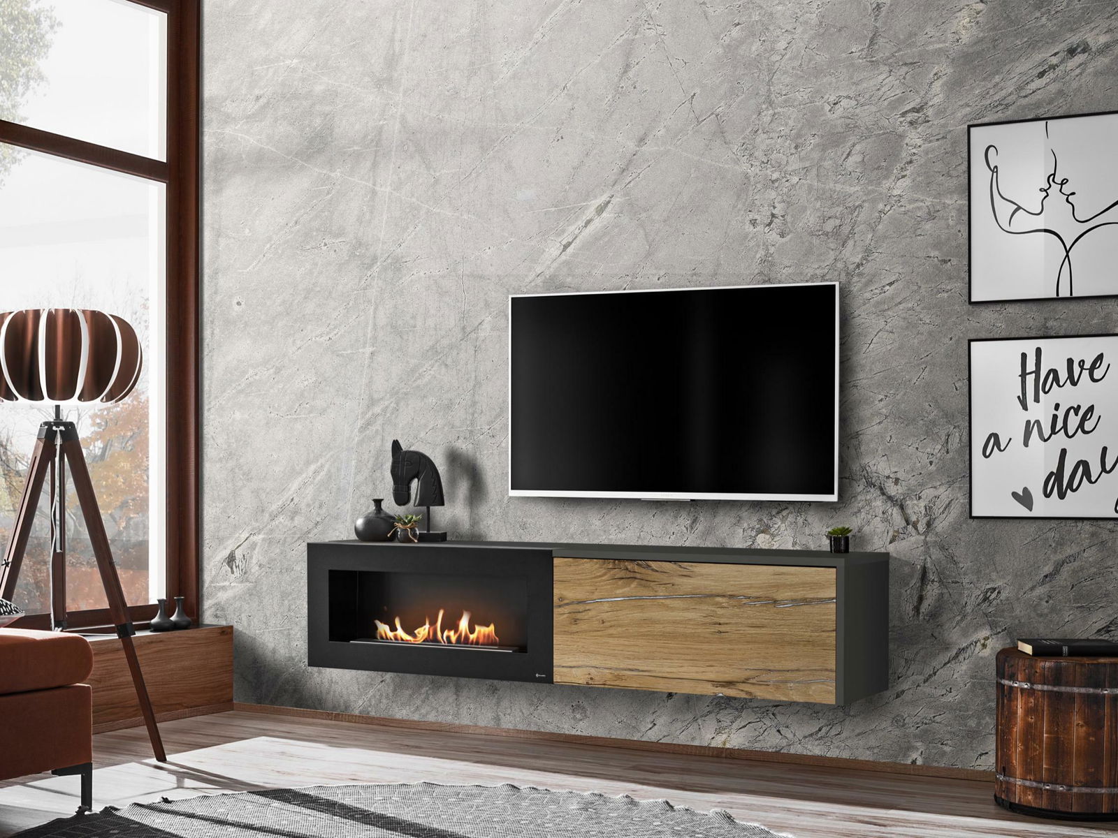 Tv stolík/skrinka Dalton (antracit + dub flagstaff) (s bio krbom)