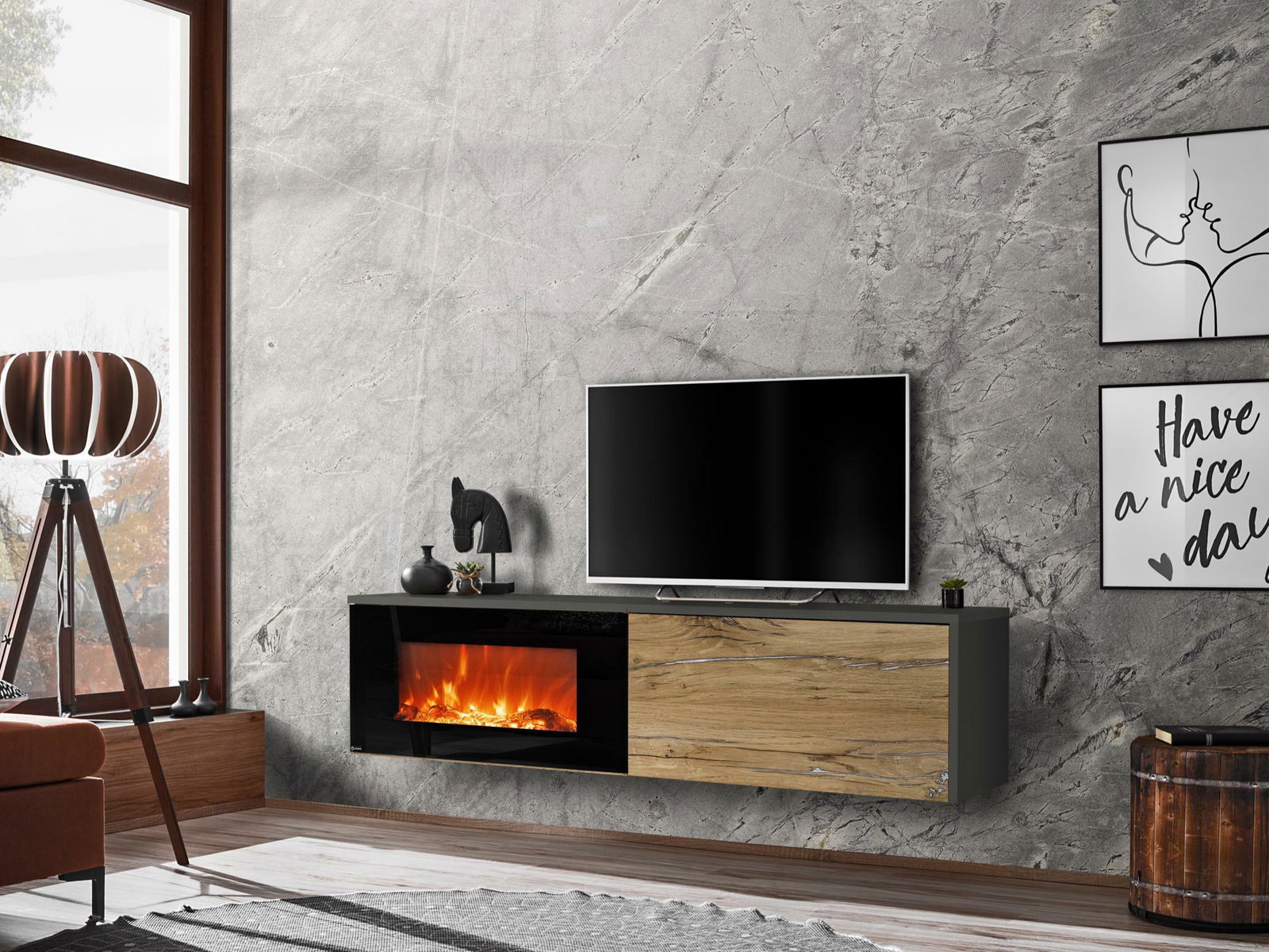 Tv stolík/skrinka Dalton (antracit + dub flagstaff) (s elektrickým krbom)
