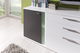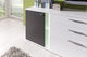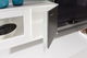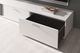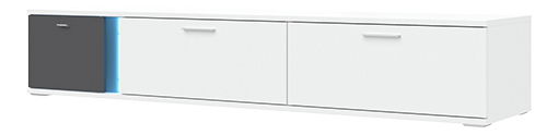 TV stolík s jednými dvierkami vľavo a dvomi zásuvkami vpravo. Zásuvka je so samodoťahom a brzdou. Medzi zásuvkou a dvierkami sa nachádza vertikálny integrovaný LED pás. Na výber máte z bielej alebo modrej farby.