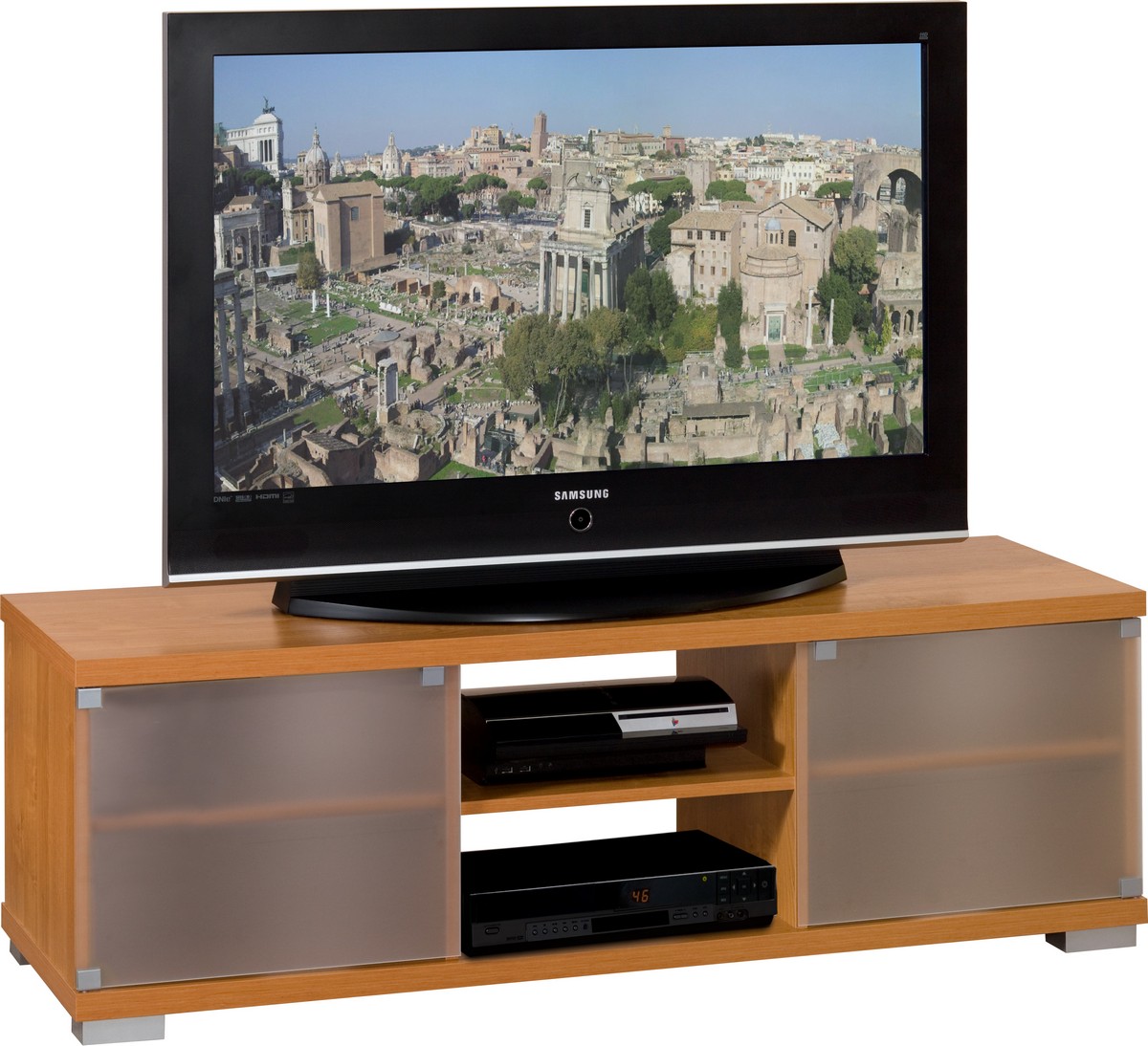 Elegantný TV stolík/skrinka. Stolík je vybavený skrinkami s presklenými dvierkami (matné biele sklo) po stranách a priestorom na audio/video zariadenia na poličkách v strede stolíka. Prevedenie je jelša a buk.