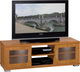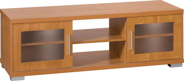 Elegantný TV stolík/skrinka. Stolík je vybavený skrinkami s presklenými dvierkami (matné biele sklo) po stranách a priestorom na audio/video zariadenia na poličkách v strede stolíka. Prevedenie je jelša a buk.
