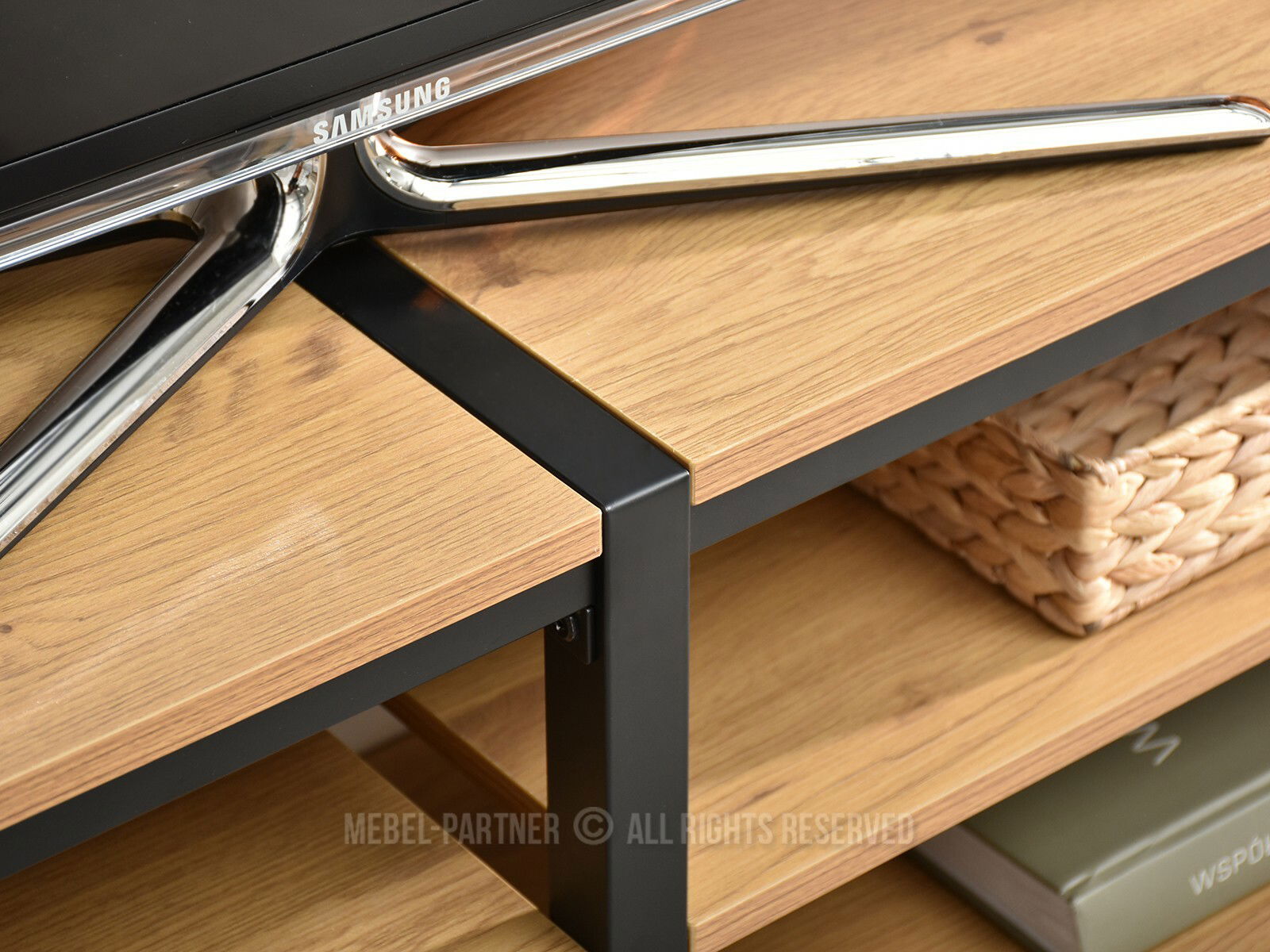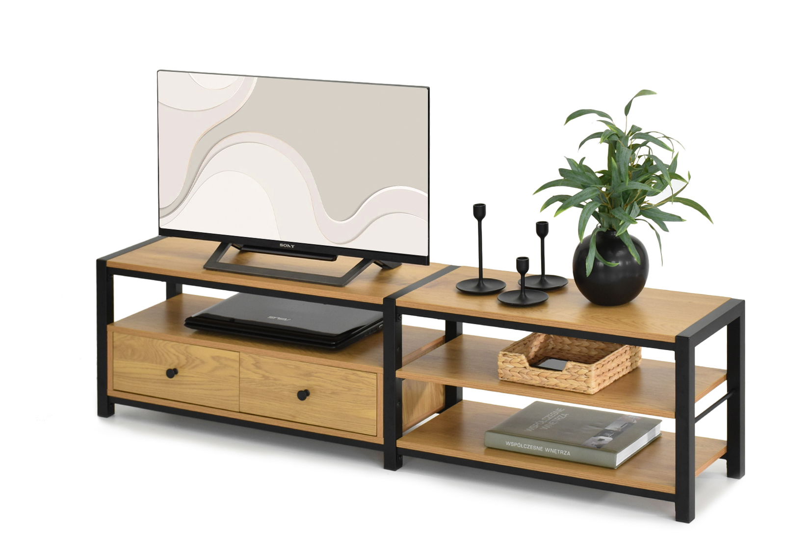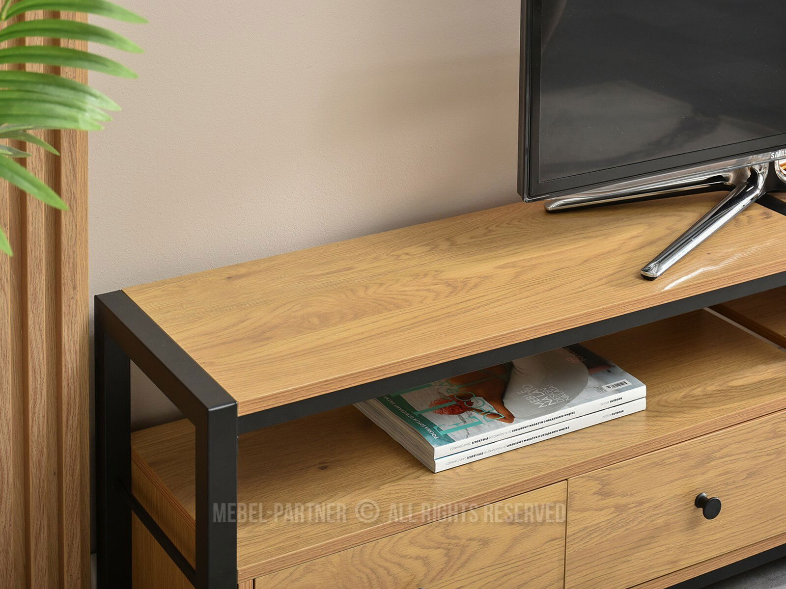 TV stolík Elena v kombinácii dubovej dyhy a čierneho kovového rámu prináša moderný a zároveň praktický doplnok do obývacej izby. Jeho jednoduchý industriálny dizajn sa ľahko zladí tak s minimalistickými, ako aj s vintage alebo škandinávskymi štýlmi zariadenia.