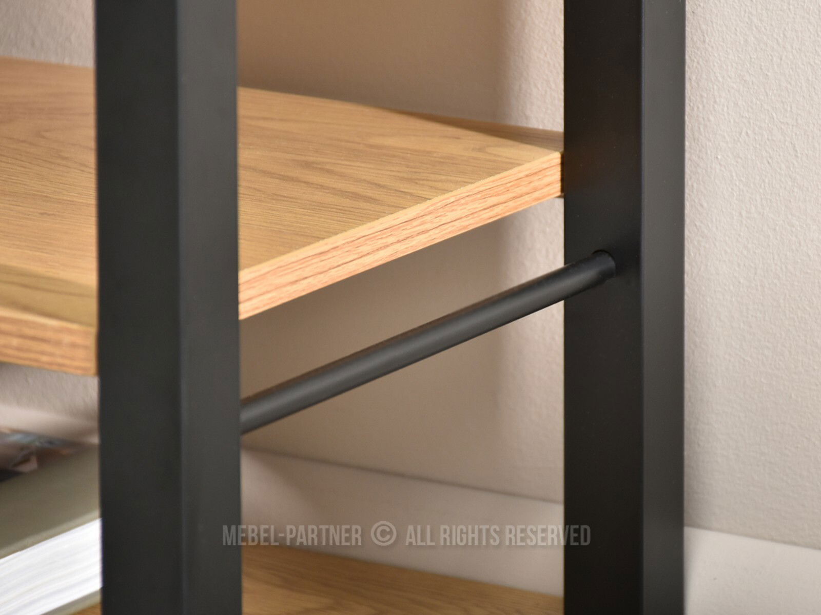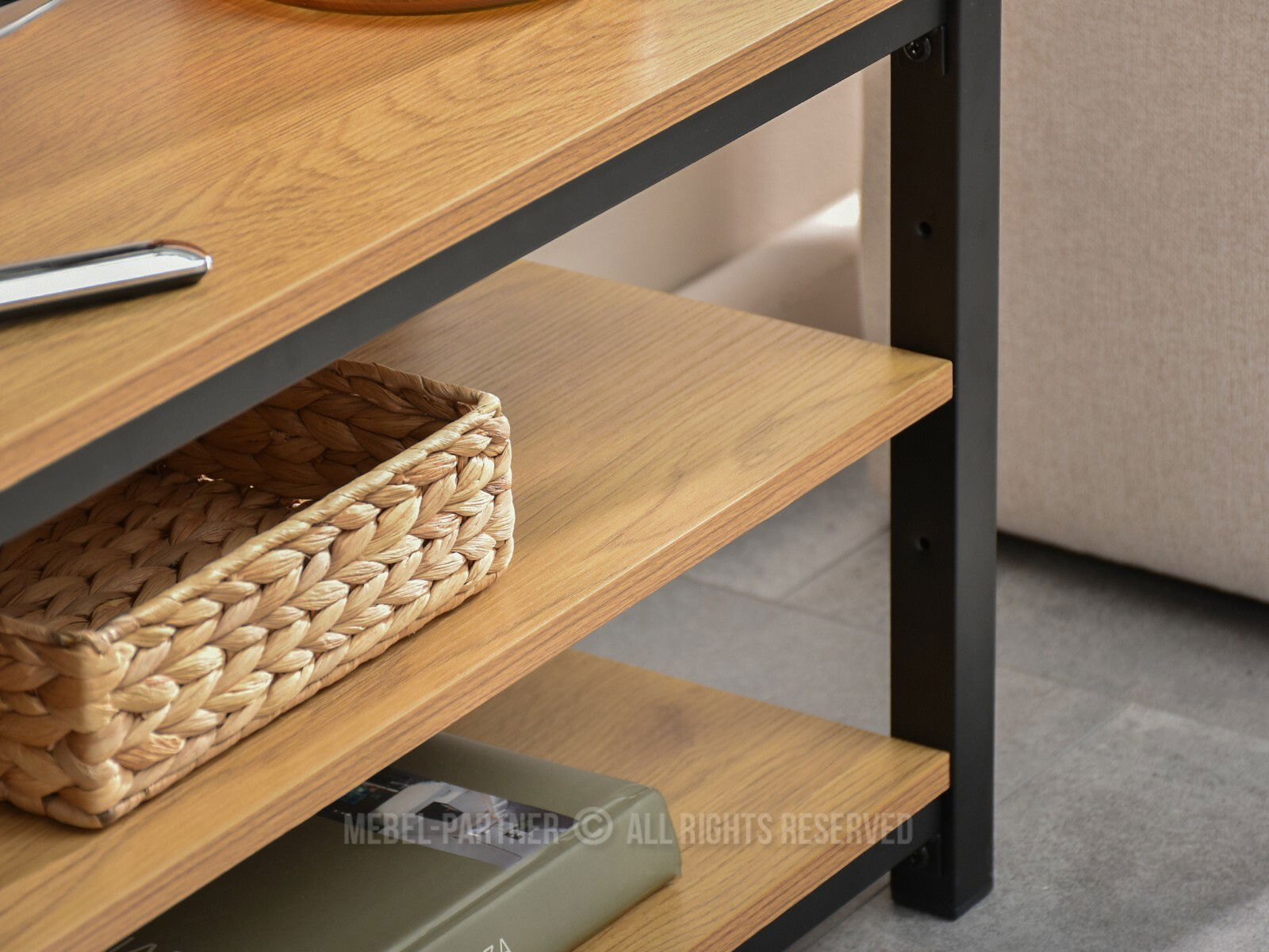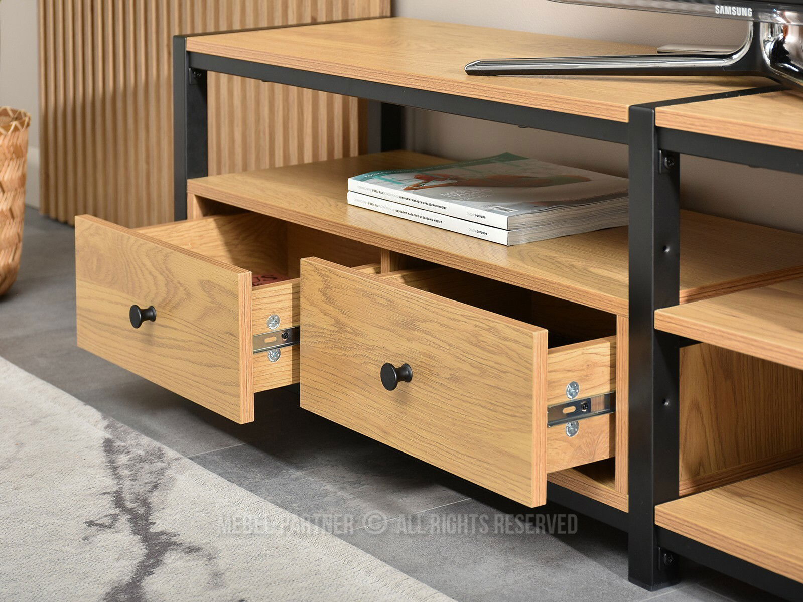 TV stolík Elena v kombinácii dubovej dyhy a čierneho kovového rámu prináša moderný a zároveň praktický doplnok do obývacej izby. Jeho jednoduchý industriálny dizajn sa ľahko zladí tak s minimalistickými, ako aj s vintage alebo škandinávskymi štýlmi zariadenia.