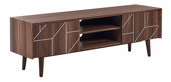 Dodajte svojmu interiéru retro atmosféru vďaka tomuto nadčasovému stolíku pod televízor. Kúsok je vyrobený z pevných a odolných materiálov s povrchovou úpravou v prírodnom odtieni tmavého dreva. Dvere skriniek sú zdobené geometrickými bielymi líniami, ktoré zdôrazňujú jeho minimalistický dizajn. Usporiadajte svoju obývačku pomocou tohto priestranného stolíka, vďaka ktorému bude stále pôsobiť úhľadne a čisto.