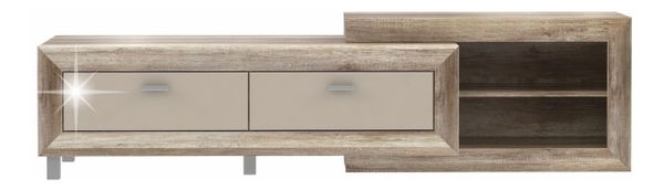 Na prvý pohľad vás tento TV stolík isto zaujme hrubším orámovaním a črtami. Tie však dopĺňajú celkový moderný dizajn stolíka, ktorý má dve otvorené poličky a dvoje dvierka. Farebné prevedenie stolíka je dub antický a lesk béžový.