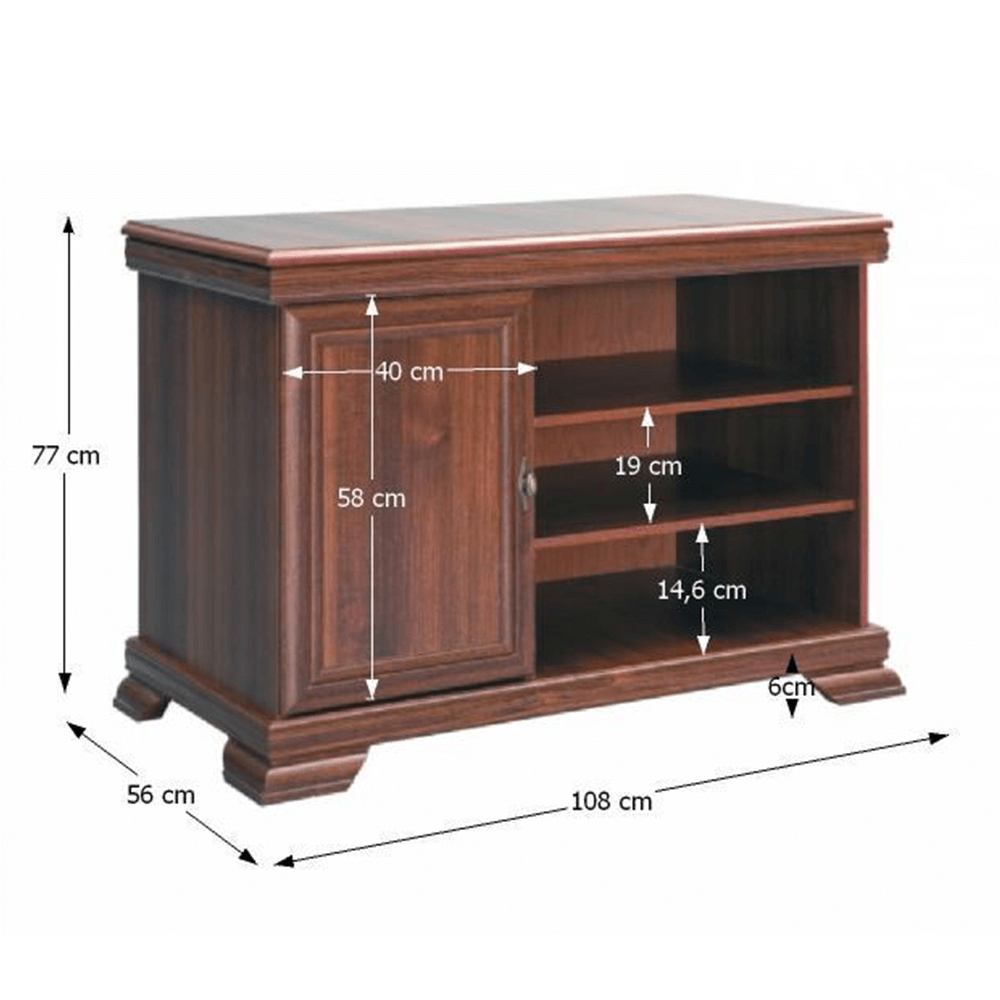 TV stolík/skrinka Kraz - KRT s výškou 77 cm a hĺbkou 56 cm v prevedení Samoa king je ideálnou voľbou pre Váš obývací priestor. Tento nerohový stolík je vyrobený z kvalitných materiálov - DTD laminovanej dosky, MDF a kovu, ktoré zaručujú jeho pevnosť a odolnosť. Stolík má rustikálny štýl, ktorý sa hodí do každého interiéru. Bez sklenenej dosky sa nemusíte obávať praskania alebo rozbitia. Stolík poskytuje dostatok miesta pre audio/video zariadenia a aj pre rôzne dekoratívne predmety. Vďaka svojmu jednoduchému a elegantnému dizajnu, bude skvelým doplnkom pre Váš domov. Sektorový nábytok Kraz je ideálny pre tých, ktorí si chcú zariadiť svoju domácnosť v rustikálnom štýle. Nábytok Kraz sa vyznačuje masívnejším vzhľadom, elegantným prevedením a kovovými úchytkami. Rozmery stolíka sú ŠxHxV: 108x56x77 cm, hrúbka materiálu korpusu je 15 mm, hrúbka materiálu vrchnej a dolnej dosky je 22 mm, a výška spodného priestoru od podlahy je 10,5 cm. Stolík sa dodáva v demonte.