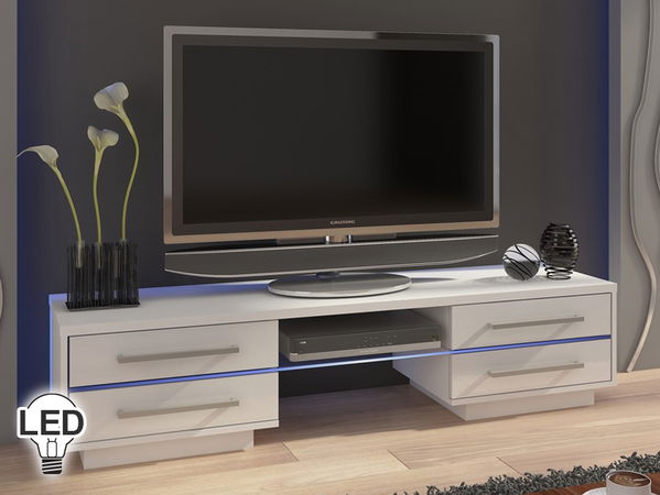 Bežný TV stolík, ale s jedinečnou novinkou. Medzi zásuvky je umiestnená sklenená polička, ktorú si môžete efektne podsvietit voliteľným LED osvetlením. To vyzerá super a dodá nábytku a miestnosti úžasný efekt. TV stolík ponúka úložný priestor v podobe štyroch zásuviek a otvorené miesto na uloženie Vašej audio/video techniky. Farebné prevedenie je biela matná v kombinácii s bielou vo vysokom lesku.