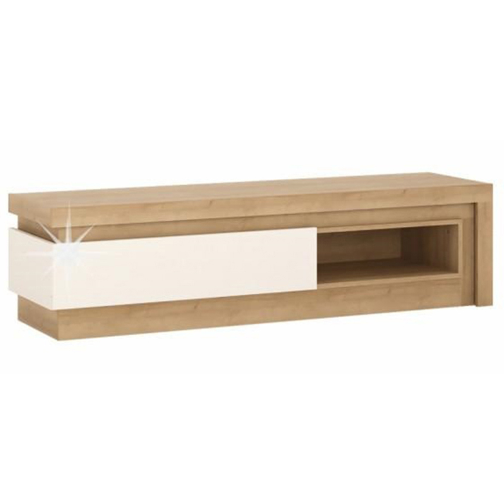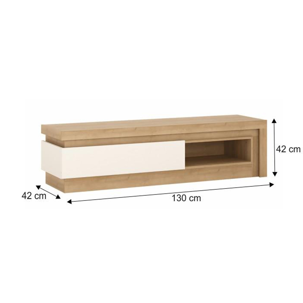 Luxusný TV stolík/skrinka Leonan 02 s osvetlením je skvelým doplnkom Vašej obývacej izby. Jeho efektné LED osvetlenie po obvode tvorí nádhernú atmosféru. Tento stolík má tiež praktickú poličku, kde môžete uložiť svoje audio/video zariadenia. Použité materiály sú odolné voči poškriabaniu a vlhkosti, čo zaručuje jeho trvanlivosť. Farebné prevedenie TV stolíka je dub riviera a extra vysoký lesk biely. Materiál DTD laminovaná a rozmery sú 130x42x42 cm s hrúbkou materiálu 16 mm. Systém tichého dorazu šuplíkov poskytuje pohodlnosť pri každodennom používaní. LED osvetlenie po obvode je v cene, a to vytvára dokonalú atmosféru vo Vašej domácnosti. Stolík sa dodáva v demonte, čo umožňuje jednoduchú montáž. Tento produkt zaručí Vášmu interiéru luxusný vzhľad a praktické využitie.