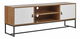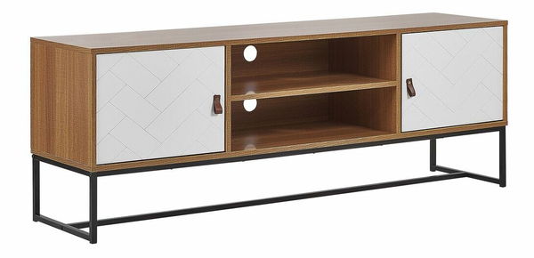Ak hľadáte tradičný nábytok s moderným nádychoch, táto TV skrinka je pre vás dokonalou voľbou. Je vyrobená z odolného MDF materiálu v kombinácii bielej farby a svetlého dreva. Skrinka stojí na čiernom kovovom podstavci, ktorý jej dodáva stabilitu. Tento kúsok ponúka dostatok úložného priestoru v podobe dvoch skriniek a dvoch políc, na ktoré môžete uložiť všetky obľúbené predmety či dekorácie. Dokonale spracované detaily, ako sú úchytky z umelej kože či matné predné dvierka s jemným vzorom rybej kosti, umocňujú jej sofistikovaný vzhľad a pútajú pozornosť.