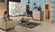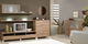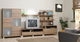 Moderná,kompaktná bytová nábytková zostava. Moderný charakter zvýrazňujú úchyty a nohy vo farbe matný chróm. Malé nohy sú kovové z hliníka. Úchyty sú plastové vo farbe hliníka a majú dvojbodové upevnenie.