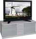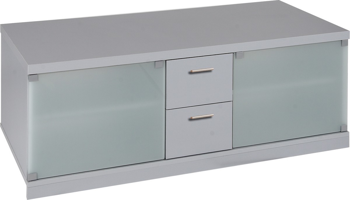 Elegantný TV stolík/skrinka. Stolík je vybavený skrinkami s presklenými dvierkami (matné biele sklo) po stranách a dvomi zásuvkami v strede stolíka. Prevedenie je hliníková farba.