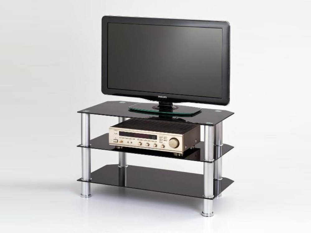 Moderný TV stolík Vás zaujme svojou funkčnosťou a dizajnom. Tri úrovne z tmavého skla sú pospájané kovovými dielmi pre doplnenie vizuálneho pôžitku z nábytku. Je vhodný ako doplnok do obývacej izby.