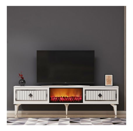TV stolík/skrinka s krbom Kebive (biela + strieborná)