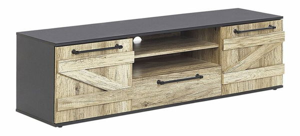 Zariaďte si obývaciu izbu v ohromujúcom rustikálnom štýle. Tento televízny stolík je vysoko funkčný kus s veľkými skrinkami a zásuvkou. Kombinácia svetlej drevenej farby so zrnitým efektom a klasickej čiernej robí interiér ešte štýlovejším. Mriežky na dvierkach skriniek evokujú vzhľad surového, prírodného nábytku v starom štýle.