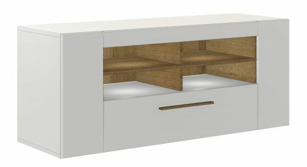 TV stolík masívnejšieho vzhľadu, ktorý Vám poskytne množstvo úložného priestoru. Uprostred sa nachádzajú štyri otvorené poličky pre Vaše audio/video zariadenia. V spodnej časti sa nachádza skrinka pre Vašu zbierku filmov, či kníh. Farebné prevedenie TV stolíka je kombinácia bielej super mat s prvkami v prevedení dub riviera. Dvierka majú systém tichého dojazdu.