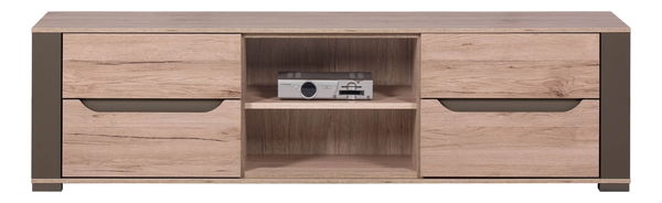Zaujímavý TV stolík/skrinka v prevedení dub sanremo v kombinácií s odtieňom latte dodá Vašej obývacej izbe žiadaný štýl. Po stranách je vybavený úložnými priestormi a dvoma otvorenými poličkami uprostred určenými pre Vaše audio/video zariadenia. Zaujímavé vykrojené úchyty a drobné nízke nožičky.
