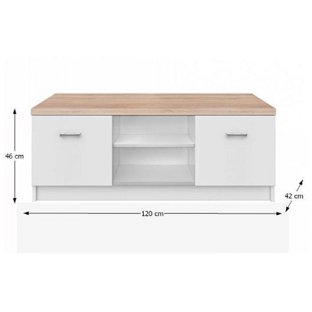 TV stolík/skrinka Timmy Typ 15 2D v bielom a dub sonoma prevedení je ideálnym doplnkom pre Vašu obývaciu izbu. Vychádza v ústrety modernému dizajnu a zároveň poskytuje praktické využitie s dvoma skrinkami a dvoma otvorenými poličkami. Skrinky sú vybavené chrómovými úchytkami pre jednoduché otváranie. Tento stolík/skrinka je vyrobený z DTD laminovaného materiálu s hrúbkou korpusu 16 mm a hrúbkou hornej dosky 32 mm. Rozmery sú 120x42x46 cm. Stolík/skrinka sa dodáva v demonte, no s jednoduchým a rýchlym zostavením. Vložte čistotu a sviežosť do Vašej obývačky s TV stolíkom/skrinkou Timmy Typ 15 2D.