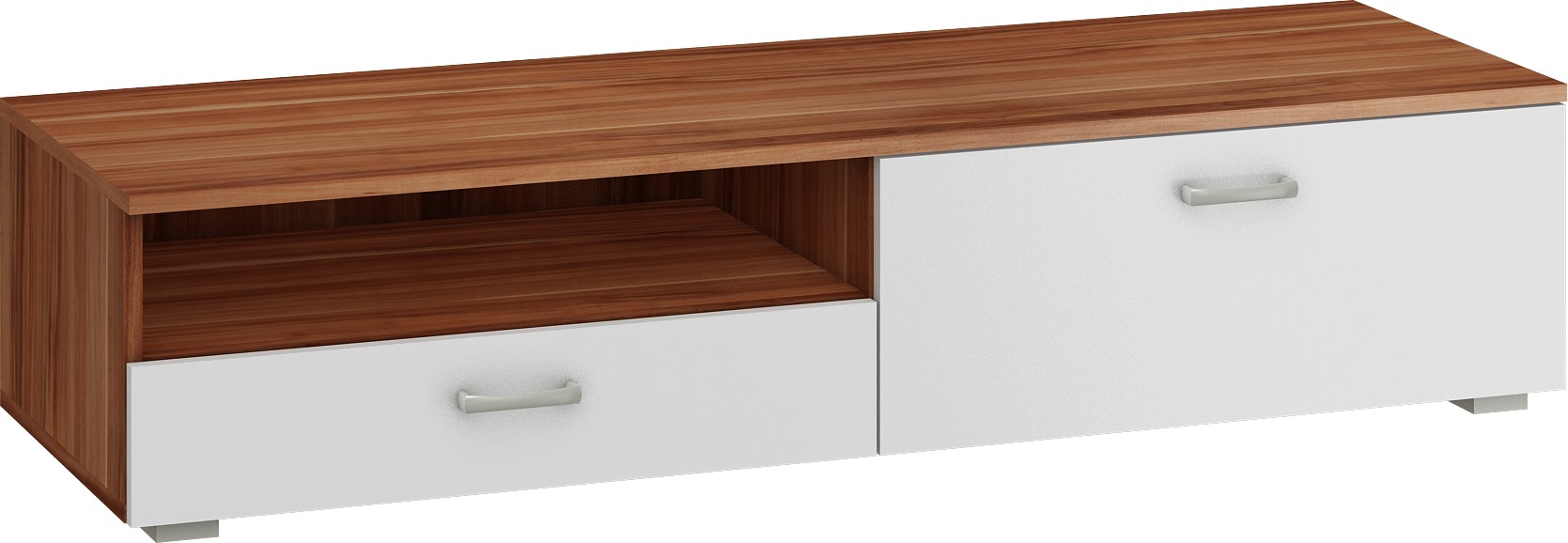 Nízky a TV stolík alebo skrinka, ktorý svojím jednoduchým štýlom ideálne zapadne do Vašej obývacej izby. Na pravej strane sa hlbšia zásuvka, na strane ľavej sa nachádza plytká zásuvka umiestnená na spodku skrinky. Nad ňou je otvorené miestno na Vaše audio/video zariadenia. Sivé tenké vodorovné úchyty na dvierkach a sivé drobné nožičky dodávajú stolíku štýl.