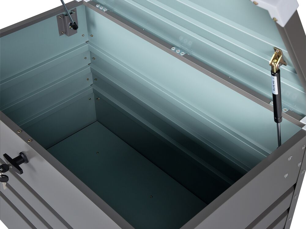 Kovový uzamykateľný kontajner môžete využiť na záhrade ako debnu na náradie, alebo ako úložný priestor pre športovú či kempingovú výbavu. Je vyrobený zo silnej ocele odolnej voči korózii. Vďaka použitému materiálu ochráni vaše veci pred poveternostnými vplyvmi. Jednoduchý dizajn a pekné farby z neho robia nielen praktický, ale aj dekoratívny prvok vo vašej záhrade.