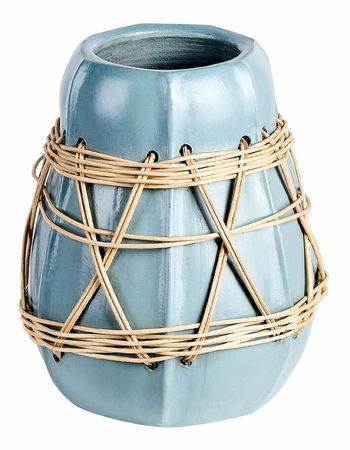 Nádherná váza s jemne zaobleným tvarom je vyrobená z terakoty, ktorú dopĺňa vzor z ratanu. Tento ručne vyrobený doplnok zapadne do moderného štýlu interiéru a bude dokonale ladiť s vintage alebo boho zariadením. Jemný pastelový odtieň modrej z nej robí dokonalú dekoráciu do miestnosti zariadenej v prímorskom štýle.