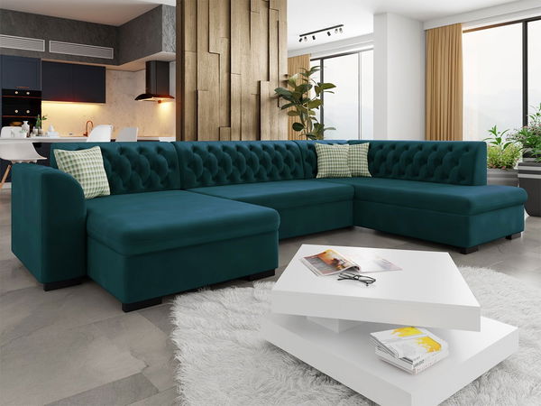 Veľká rohová sedačka do obývačky Emrys spája klasiku s moderným štýlom. Jednoduchý minimalistický tvar púta pozornosť vďaka štýlovému prešívaniu, ktoré sa spája s eleganciou a luxusom. Možnosť výberu z niekoľkých farieb navyše umožňuje dodať nábytku individuálny charakter. Jedinečný dizajn však nie je všetko. Rohová sedačka do obývačky sa vyznačuje aj praktickými riešeniami. Bol vytvorený v tvare písmena "U", takže má veľmi veľkú plochu na spanie, ktorá Vám umožní pohodlne si oddýchnuť a nabrať sily na ďalší deň. Rohová pohovka s funkciou spánku má veľký kontajner na posteľnú bielizeň - zmestia sa do nej vankúše, prikrývky alebo iné predmety, ktoré nie sú na očiach. Zadná časť rohovej sedačky je celopotiahnutá látkou, takže ju môžete umiestniť kdekoľvek v obývačke. Toto riešenie je ideálne na oddelenie salónika od jedálenského kúta. Rozkladacia rohová sedačka je vyrobená z kvalitných komponentov, čo zaisťuje mimoriadnu odolnosť a životnosť na roky. Celok je doplnený o dekoračné vankúšiky zapínané na zips. Látka Magic Velvet použitá na čalúnenie rohovej sedačky je vysoko odolná proti žmolkovaniu a vyblednutiu farieb - rohová sedačka si zachová svoj dokonalý vzhľad po dlhú dobu. Táto látka je neuveriteľne jemná a príjemná na dotyk a vďaka vlastnostiam zamatu sa efektívne leskne. Kombinácia kvalitnej látky a štýlového prešívania vytvorí v interiéri niečo jedinečné, z čoho len ťažko odtrhnete zrak.