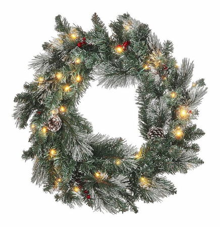 Vyzdobte svoj domov výraznými vianočnými dekoráciami, aby ste cítili pravú atmosféru sviatočného obdobia. Tento veniec je dodávaný so zabudovanými LED svetlami, ktoré jemne osvetlia celý interiér. Súčasťou je aj praktický časovač, ktorý sa dá nastaviť tak, aby sa svetlá po 8 hodinách automaticky vypli. Zelené vetvičky v kompozícii so šiškami a bobuľami vytvárajú prírodný vzhľad a nevyžadujú si častú údržbu. Dekoráciu môžete umiestniť na stôl alebo zavesiť nad krb a skombinovať ju s inými dekoráciami, aby ste do svojho interiéru vniesli vianočnú náladu.
