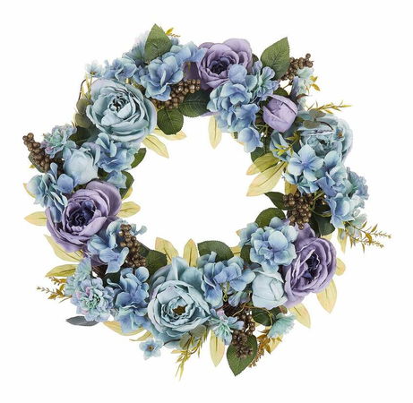 Tento okrúhly kvetinový veniec dodá vášmu interiéru alebo vchodovým dverám jedinečný charakter. Kombinácia pivoniek a hortenzií v odtieňoch modrej a fialovej vyzerá nádherne a vynikne na bielych a sivých stenách alebo dverách. Vďaka praktickému háčiku ho môžete ľahko zavesiť na vaše obľúbené miesto. Veniec je vyrobený z vetvičiek a vysokokvalitných umelých kvetov s polyesterovými lístkami, takže si nevyžaduje žiadnu zvláštnu starostlivosť a bude vám slúžiť roky.