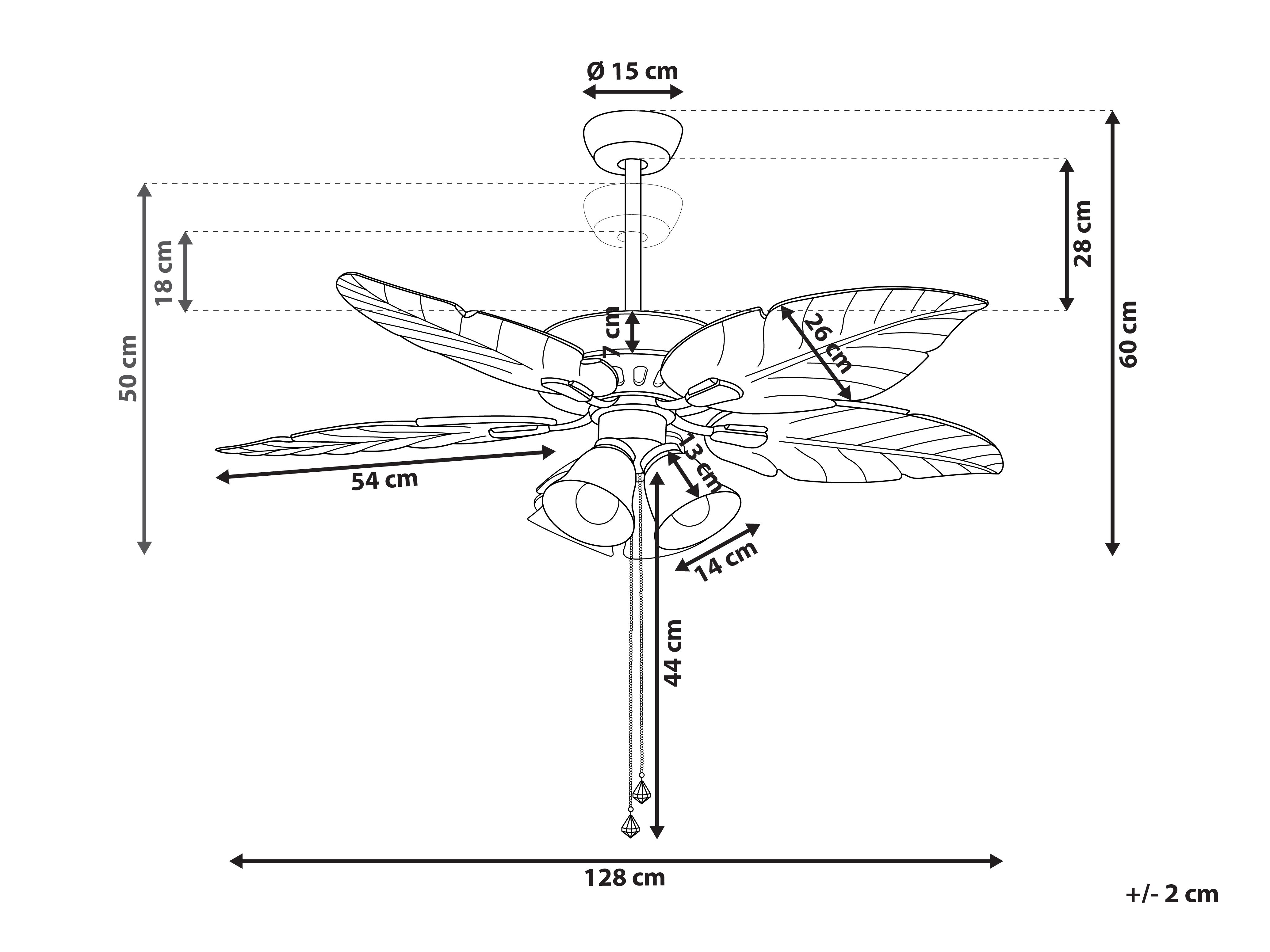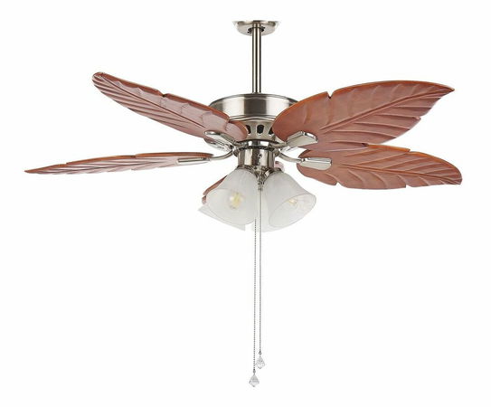 Tento multifunkčný stropný ventilátor osvetlí váš interiér a zaistí dobré prúdenie vzduchu počas celého roka. Vďaka retiazkovému ovládaniu s ozdobným sklíčkom sa pohodlne a ľahko používa. Nastavte požadovanú rýchlosť a smer chodu ventilátora a užite si chladivý efekt v lete a správnu cirkuláciu vzduchu v zime. Sklenené tienidlá v tvare kvetov a drevené čepele v tvare listov robia z tohto stropného ventilátora nádhernú dekoráciu vhodnú do každej spálne, obývačky alebo kuchyne. Obzvlášť dobre vynikne v interiéri zariadenom v tradičnom alebo retro štýle.
