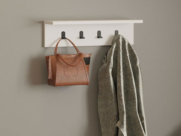 - Štyri kovové háčiky ponúkajú dostatok miesta na zavesenie kabátov, tašiek alebo šálov.