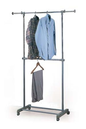 Kovový vešiak na kolieskach s jedným ramenom s dvomi priečkami na vešiaky s odevmi. Vešiak je vo farebnej kombinácií chrómu a šedej
