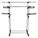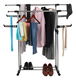 Praktický dvojramenný pojazdný vešiak vyrobený z nerezového kovu a čiernej plastovej základne. Na oboch ramenách sa nachádzajú doplnkové háky v čiernej farbe, priečne spevnenia medzi ramenami dodávajú stabilitu.