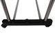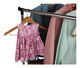Praktický dvojramenný pojazdný vešiak vyrobený z nerezového kovu a čiernej plastovej základne, priečne spevnenie je tvorené doplnkovými tenkými tyčkami umiestnenými medzi ramenami, ktoré majú dodať stabilitu.