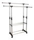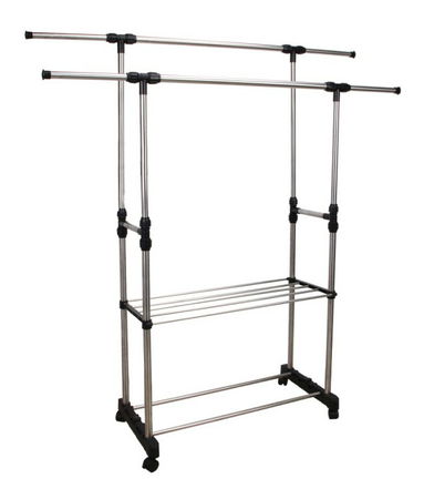Praktický dvojramenný pojazdný vešiak vyrobený z nerezového kovu a čiernej plastovej základne, priečne spevnenie je tvorené doplnkovými tenkými tyčkami umiestnenými medzi ramenami, ktoré majú dodať stabilitu.
