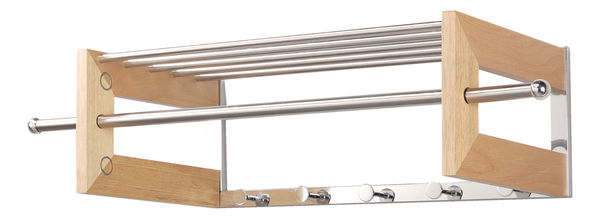 Praktický vešiak na stenu. Konštrukcia je kombináciou kovu chrómovej farby a prirodného dreva. Päť vešiakov a tyč poskytuje dostatok priestoru na zavesenie odevu. V hornej časti sa nachádza odkladacia polička tvorená z menších tyčiek.