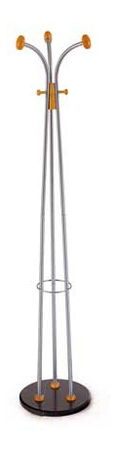Kovový vešiak s kruhovou základňou a s tromi nohami v prevedení hliník s háčikmi na dvoch kovových prvkoch v hornej časti.