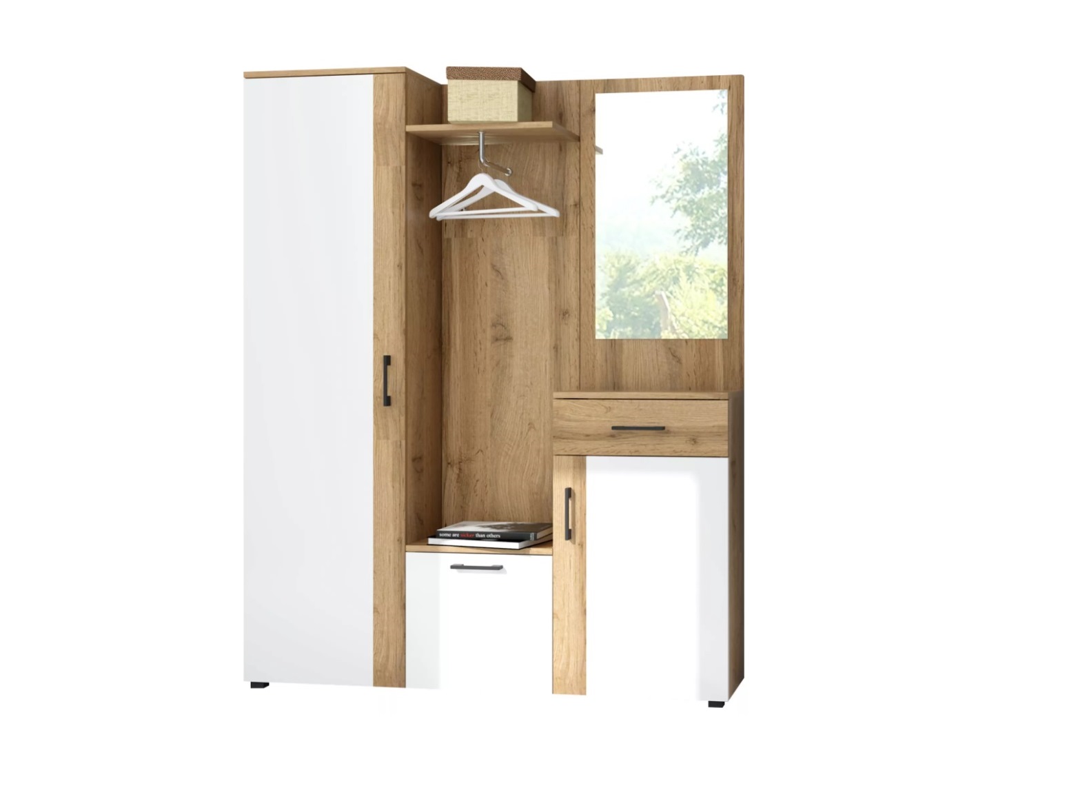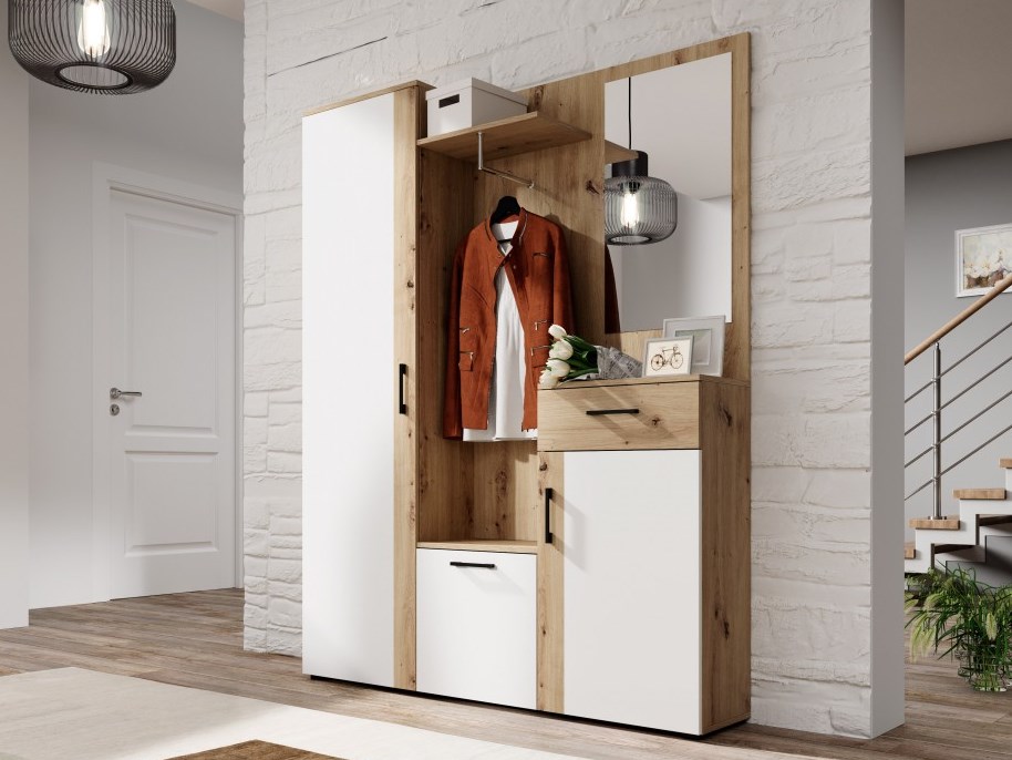 Vešiaková stena Trudy (dub artisan + biela) je skvelým doplnkom do vášho domova. Tento výrobok ponúka dostatok úložného priestoru pre vašu oblečenie, ktoré si môžete usporiadať podľa svojho vkusu. Vešiaková stena je vyrobená z kvalitného dreva dub artisan a biela farba ju robí modernou a elegantnou. Vysoká 184 cm a hlboká 29 cm, táto vešiaková stena má dostatok miesta pre vašu obuv, kabelky a ďalšie doplnky. Svojím jednoduchým a moderným dizajnom sa hodí do každého interiéru. Vešiaková stena Trudy (dub artisan + biela) je navyše veľmi jednoduchá na zostavenie a bude vám slúžiť po dlhé roky. Doprajte si tento praktický a štýlový kúsok nábytku a ušetrite si priestor v svojej šatni!