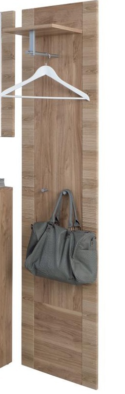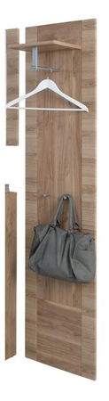 Jednoduchý vešiakový panel s moderným dizajnom. V jeho vrchnej časti sa nachádza menšia odkladacia polička s kovovou tyčkou, na ktorú si môžete zavesiť vešiaky s oblečením. Uprostred sa nachádzajú dva vešiaky.
