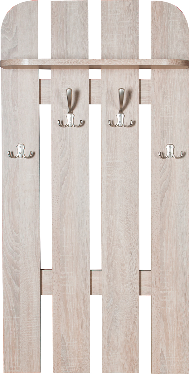 Dekoratívny vešiakový panel vo farbe dubu sonoma je vhodným doplnkom do predsiene. Pod odkladacou poličkou sú umiestnené dva dvoj a dva trojhákové kovové vešiaky.