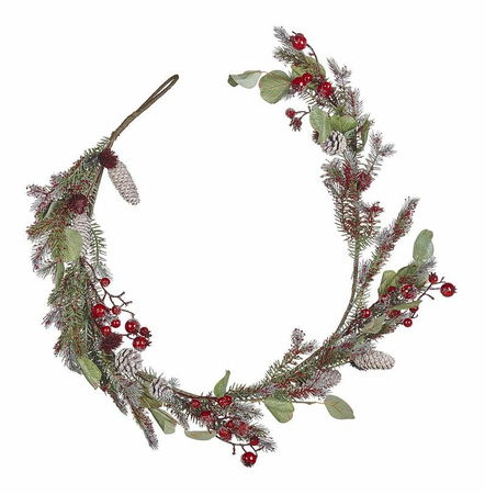 Užívajte si veselú atmosféru zimnej sezóny aj u vás doma s vianočnými dekoráciami, ktoré si vyžadujú minimálnu údržbu. Táto umelá girlanda vyzerá veľmi prirodzene aj napriek použitiu syntetických materiálov. Zelené listy, vetvičky borovice a šišky sú doplnené červenými bobuľkami a vytvárajú skutočne pútavú kompozíciu. Túto dekoráciu môžete zladiť s inými ozdobami a vniesť do svojho interiéru vianočnú atmosféru.
