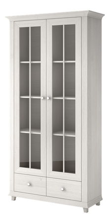 Dvojdverová presklená vitrína so štyrmi poličkami a dvoma nepresklenými zásuvkami naspodku.